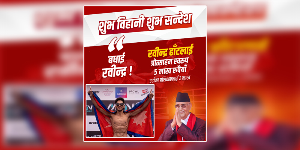 साउन २८ गते । आफ्ना भारतीय प्रतिद्वन्द्वीलाई हराउँदै म्याट्रिक्स फाइट नाइट (एमएफएन) बान्टमवेट च्याम्पियन बन्न सफल बझाङका रवीन्द्र ढाँटलाई प्रोत्साहनस्वरुप रु. पाँच लाख प्रदान गरिने भएको छ ।